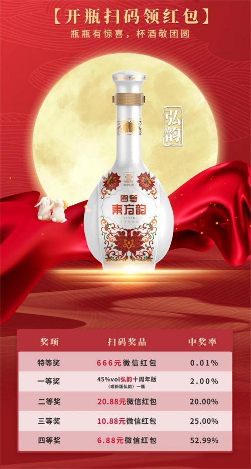 不僅如此,四特酒還準備了一大波奧運掃碼福利活動,十分誘人。只需輕松一刮四特東方韻·弘韻瓶蓋上的二維碼涂層,然后用微信掃一掃跟隨頁面簡單指引(首次參與請預留手機號碼),即可參與紅包抽獎活動。豪華的獎品陣容,不僅有高達666元的紅包大獎,還有45%vol弘韻十周年版(或新版弘韻)美酒一瓶,更有眾多6.88元~20.88元不等的紅包獎勵,中獎機會高達百分之百。讓體育迷們在觀賽之余,更添一份意外的驚喜與快樂。另外,在此提醒大家:美酒雖好,切莫貪杯,適量飲酒,才能享受快樂。
