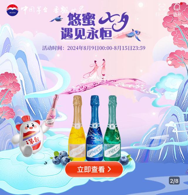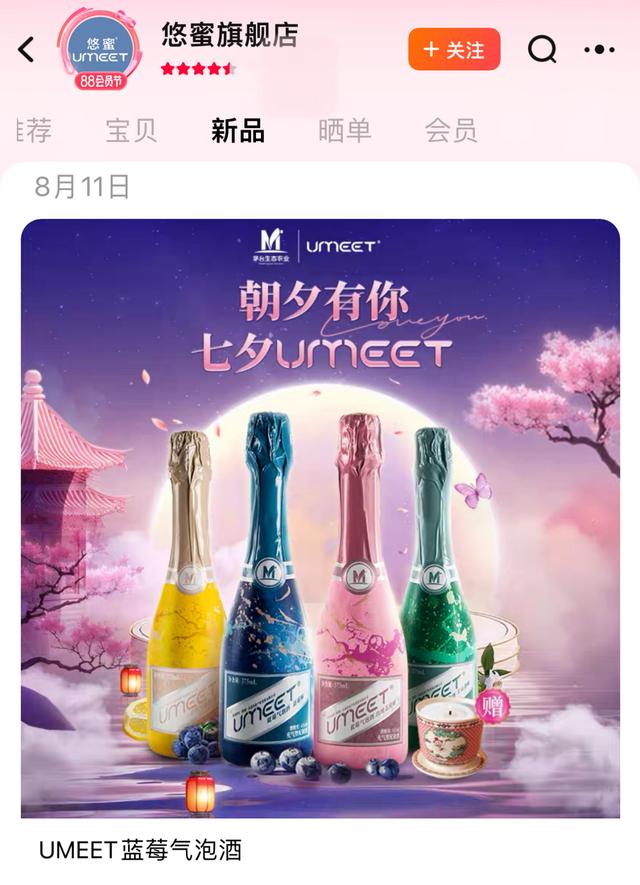 除此之外,8月11日0點(diǎn),在天貓悠蜜旗艦店UMEET藍(lán)莓氣泡酒也同步上新,同時(shí)啟動(dòng)了“朝夕有你 七夕UMEET”主題活動(dòng),在8月11日00:00至8月14日23:59,購(gòu)買UMEET藍(lán)莓氣泡酒兩瓶及以上,即可獲得茅臺(tái)香薰一份。為消費(fèi)者的七夕點(diǎn)燃甜蜜氛圍,進(jìn)行浪漫加成。