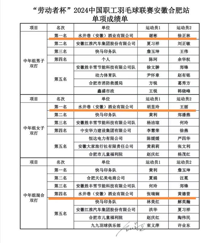 經過一輪又一輪的激烈比拼,水井巷酒業的團隊憑借著頑強的斗志、精湛的球技和默契的配合,一路過關斬將,在眾多實力強勁的參賽隊伍中脫穎而出,喜獲中年組團體第一;男雙第一、女雙第一;混雙第四佳績。