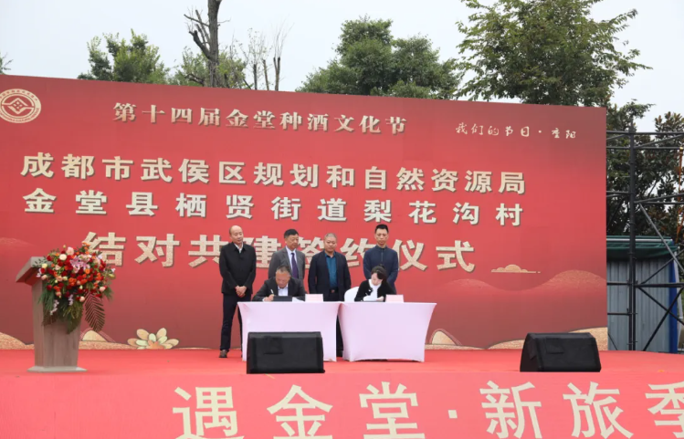 活動伊始,城鄉結對發展簽約儀式首先展開。為深入貫 徹落實中央和省委、市委關于推進城鄉融合發展部署要求,著力構建城鄉基層黨組織互幫互助常態化、長效化機制,形成以城帶鄉、以鄉促城、優勢互補、共同提高的基層黨建工作新格局,助推梨花溝村產業發展。在成都市武侯區規劃和自然資源局二級調研員、黨支部書記張紅軍,梨花溝村第一書記羅興國,棲賢街道黨工委委員、辦事處副主任付翔韜的見證下雙方簽訂了結對共建協議。相信通過“城鄉共建、結對發展”,梨花溝村一定會迎來發展的又一個春天。