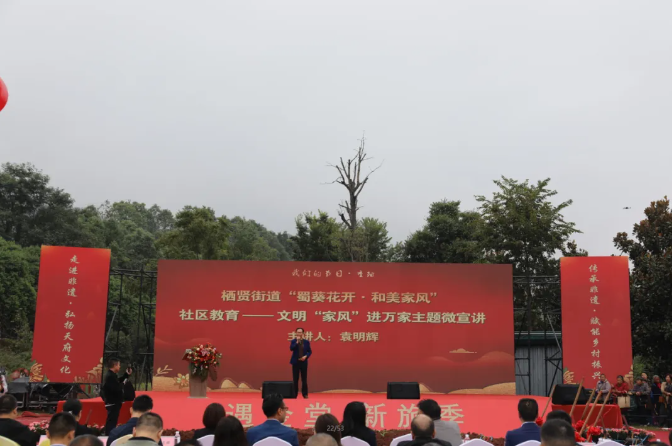家風傳承之后,是村風建設。文明鄉村造就淳樸鄉風、良好家風、淳樸民風,梨花酒鄉每年都煥發著新氣象,重陽種酒,此時人間情正濃。為進一步培育和踐行社會主義核心價值觀,發揮先進典型的示范引領作用,在主持人的領導下,2024年度棲賢街道“孝善模范”表彰,與“蜀葵花開·和美家風”微宣講,也在活動現場順利開展。
