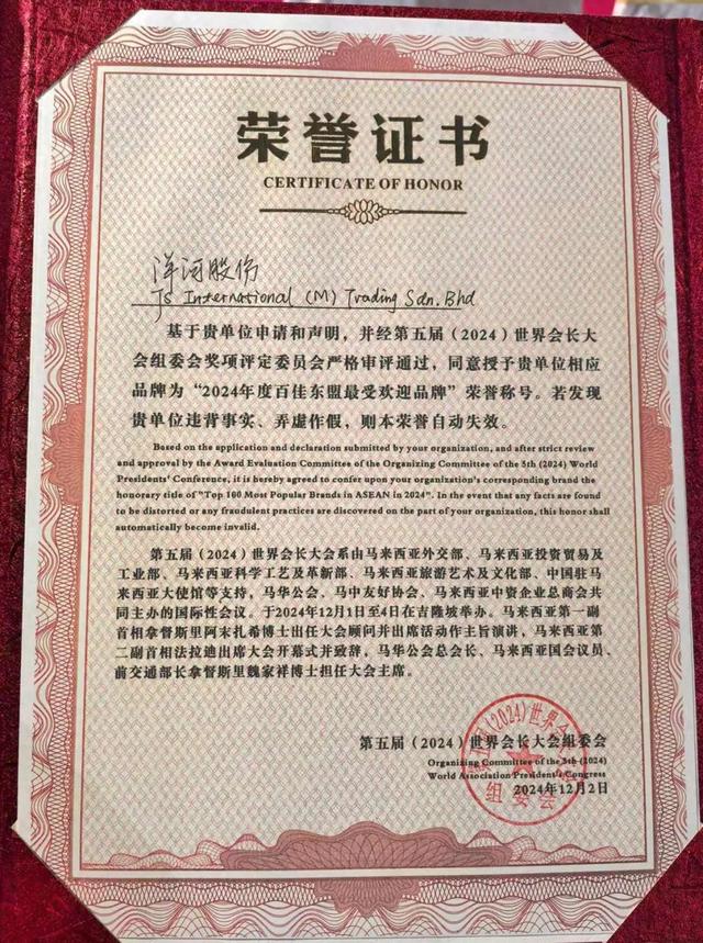 12月2日,在馬來西亞吉隆坡舉辦的第五屆(2024)世界會長大會上,洋河被授予“2024年度百佳東盟最受歡迎品牌”榮譽稱號。