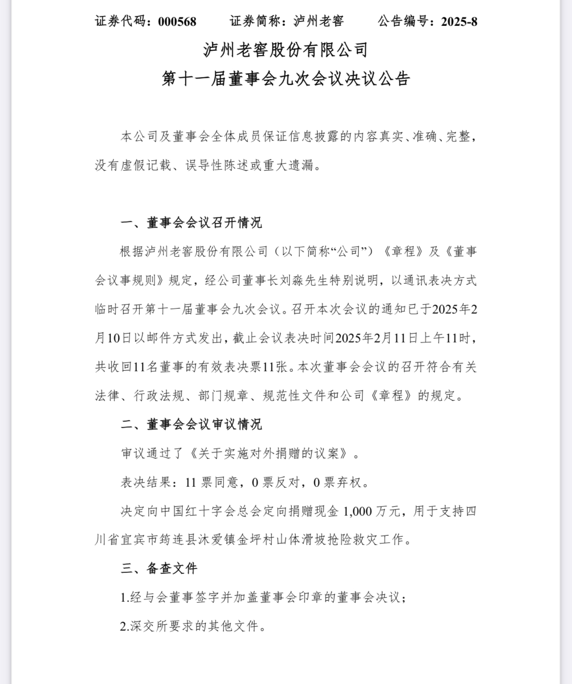2月11日,瀘州老窖發布公告稱,公司決定向中國紅十字會總會定向捐贈現金1000萬元,用于支持四川省宜賓市筠連縣沐愛鎮金坪村山體滑坡搶險救災工作。