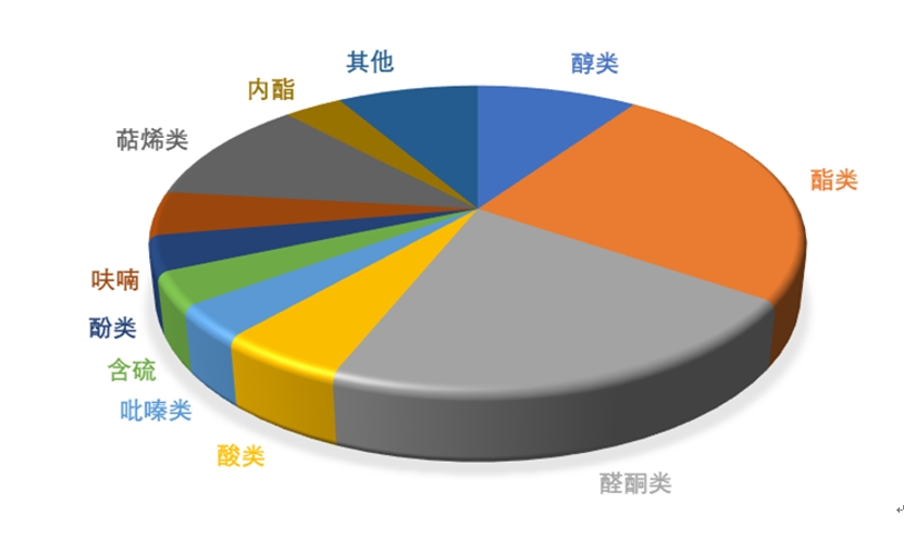 “茅臺鎮(zhèn)核心產(chǎn)區(qū)醬香國臺酒風(fēng)味特征及生物活性組分研究”項(xiàng)目采用先進(jìn)分析技術(shù)系統(tǒng)解析了“茅臺鎮(zhèn)核心產(chǎn)區(qū)醬香白酒”國臺酒揮發(fā)性組分特征,在國臺酒中鑒定出揮發(fā)性組分超過1000種,建立了國臺酒揮發(fā)性組分信息庫。其中醇類化合物213種,酯類化合物228種,醛酮類化合物177種,酸類化合物65種,含氮類化合物68種,含硫化合物25種,酚類化合物28種,呋喃類化合物42種,萜烯120種,內(nèi)酯27種,其他類化合物189種。
