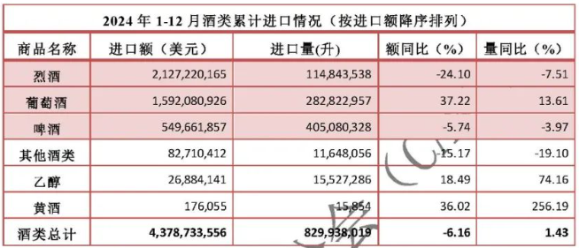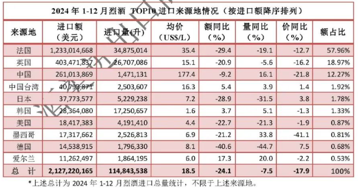 烈酒方面,進口數據顯示,烈酒全年累計金額保持較高跌幅,數量降幅進一步縮窄。進口額21.3億美元,下降24.1%;進口量1.1億升,下降7.5%,在進口酒總額中占比48.6%。其中: