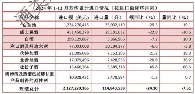 白蘭地繼續高速下行。白蘭地自2024年6月開始,一路加速下挫,全年累計金額12.3億美元,跌幅近30%;數量3503萬升,跌幅19.1%,在烈酒進口總額占比下滑至58.0%。