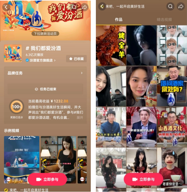 2024年,#我們都愛汾酒 抖音挑戰(zhàn)賽再次掀起“汾”享熱潮,活動上線11天完美收官,播放量突破6.3億次,成為全民參與的現(xiàn)象級熱點。