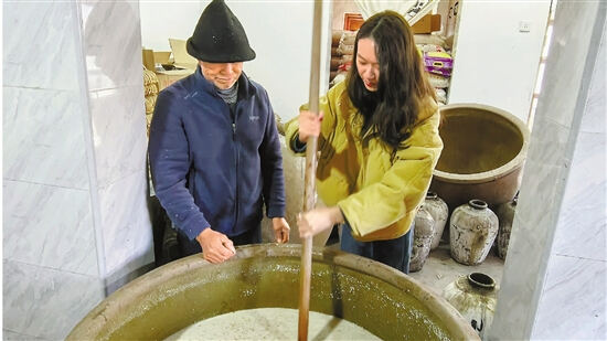 在南村村薛記酒坊,記者徐添城(右)體驗釀制黃酒。