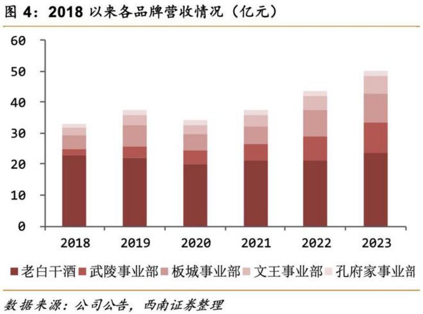 孔府家酒業扎根山東曲阜,前身系1958年成立的國營酒廠曲阜酒廠。1993年,孔府家酒業曾憑借央視廣告迅速崛起,但近年來業績滑坡,多次易主。2018年,成為老白干酒全資子公司后,其發展依舊曲折。據老白干酒財報的數據顯示,2018年至2023年,孔府家系列酒分別實現營收0.98億元、1.62億元、1.48億元、1.77億元、1.46億元、1.79億元;2023年,孔府家系列酒營收占比僅約3.6%。