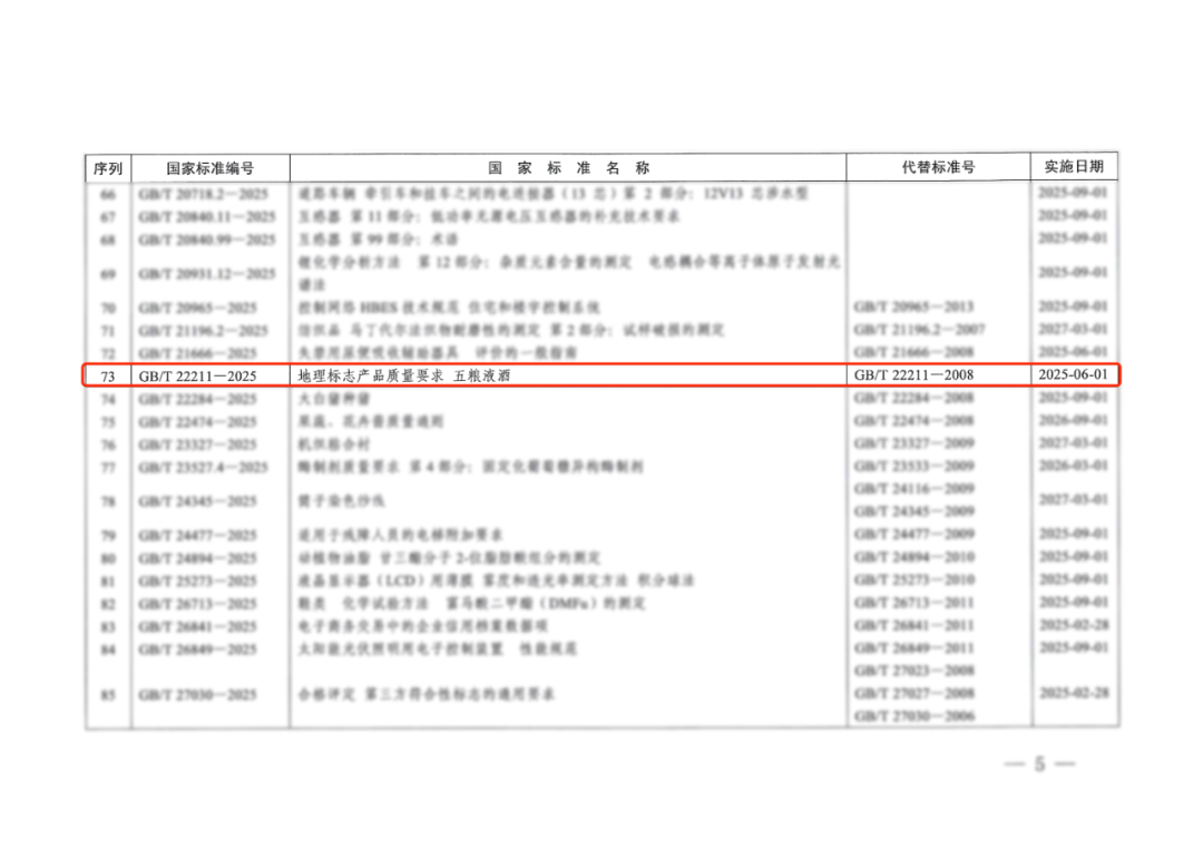 日前,國(guó)家市場(chǎng)監(jiān)督管理總局(國(guó)家標(biāo)準(zhǔn)化管理委員會(huì))發(fā)布《關(guān)于批準(zhǔn)發(fā)布<工業(yè)用合成鹽酸>等273項(xiàng)推薦性國(guó)家標(biāo)準(zhǔn)和9項(xiàng)推薦性國(guó)家標(biāo)準(zhǔn)修改單的公告》。其中,GB/T 22211-2025《地理標(biāo)志產(chǎn)品質(zhì)量要求 五糧液(000858)酒》作為白酒行業(yè)的重要標(biāo)準(zhǔn),將于6月1日正式實(shí)施。這一標(biāo)準(zhǔn)的發(fā)布標(biāo)志著我國(guó)地理標(biāo)志產(chǎn)品保護(hù)體系進(jìn)一步完善,為五糧液酒的高質(zhì)量發(fā)展提供了權(quán)威技術(shù)支撐。