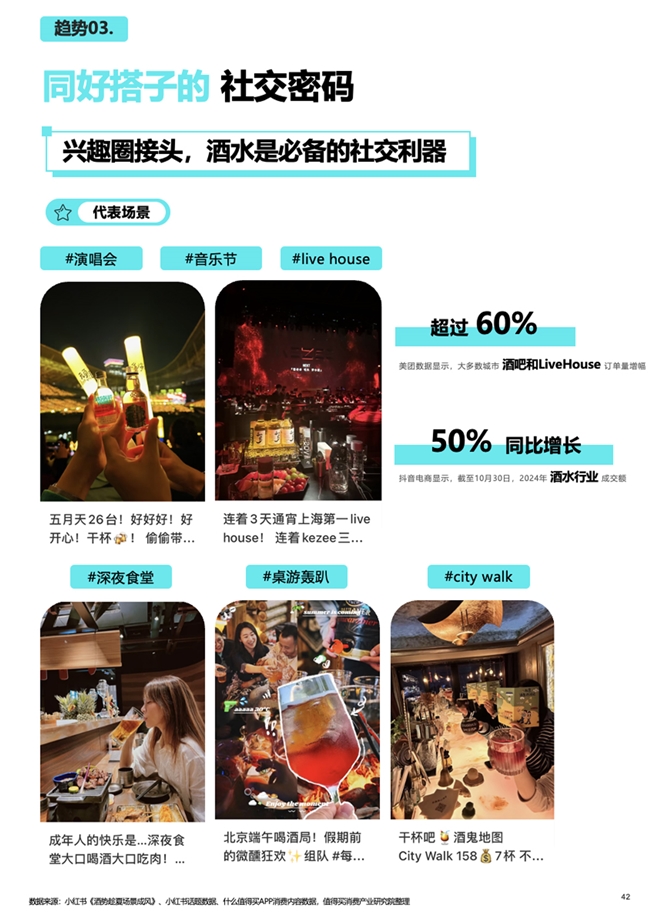 與此同時,居家微醺式飲酒和社交小酌式飲酒,也成為年輕消費者情感的寄托。不同的是,居家微醺更適配獨居場景,幫助消費者在忙碌一天后放松身心,在舒適環境中探索和自我對話,從而獲得心理上的滿足;2024年1-11月,值得買大數據平臺收錄的#微醺時刻#話題互動量超過5384萬。社交小酌則更適合年輕群體構建自己的同好搭子,比如在朋友歡聚、音樂節等場景,酒水已成為圈層和興趣社交的利器;美團數據顯示,大多數城市酒吧和LiveHouse訂單量增幅超60%。