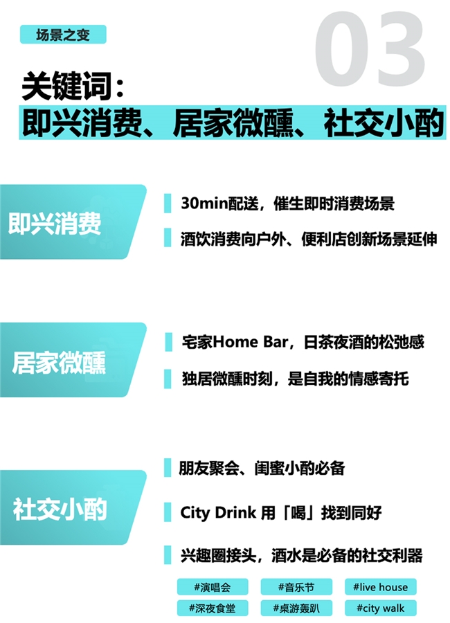 在飲酒場景層面,整個市場正發生深刻且多元的變化,整體呈現“即時性消費場景持續擴張、居家飲酒場景愈發重要、社交場景更加細分和多元”的趨勢。具體來看,隨著即時零售、線下新零售、傳統商超等渠道的發展,消費者不再局限于計劃性購物,而是更加傾向于即興消費,酒飲消費向戶外、便利店創新場景延伸。