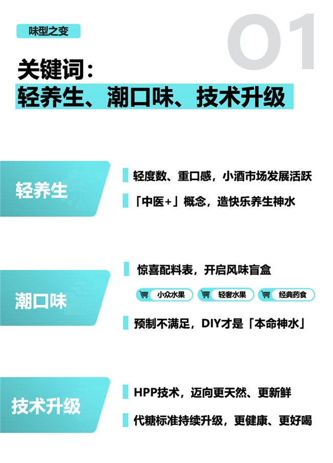 報告顯示,酒水飲料在味型方面呈現出“輕養生、潮口味、技術升級”三大趨勢。隨著年輕群體健康意識覺醒,酒水原始功能屬性向“輕養生”讓渡,“中醫+”概念打造了快樂養生神水,紅豆、枸杞、紅棗、薏米等主打食藥同補的成分,在酒水市場甚為活躍。