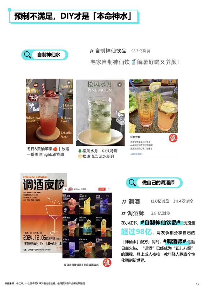在口味層面,小眾輕奢水果、經典食藥持續出圈,柑橘類目最為明顯,霸氣油柑推出后已成奈雪爆款,整體銷量占比超25%;DIY調酒也深受年輕人追捧,消費者都爭相分享自己的“神仙水”配方。同時,非濃縮還原和超高壓冷殺菌等技術的升級,也讓酒水飲料更健康、更天然、更新鮮。