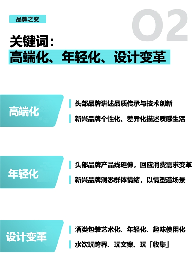 在品牌層面,當前,整個酒水品牌市場呈現出“高端化”、“年輕化”和“設計變革”的趨勢。根據報告,頭部品牌產品更加細分,新興品牌加速入場,二者在品牌包裝設計理念變革上,都更傾向于用藝術化、年輕化和趣味化的表達來詮釋新藝術、新世代、新美學,并通過玩跨界、玩文案、玩收集等趣味互動方式與年輕群體拉近距離,增強消費者對品牌的認同與黏性。