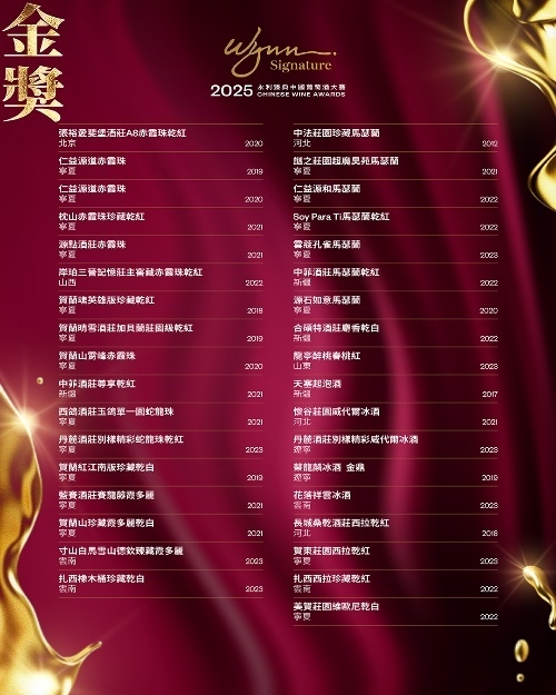 評(píng)審團(tuán)經(jīng)過(guò)層層選拔,從金獎(jiǎng)佳釀中選出“年度最佳中國(guó)葡萄酒”以及“永利臻典獎(jiǎng)”、“卓越品種獎(jiǎng)”及“產(chǎn)區(qū)冠軍獎(jiǎng)”三大類別下的各個(gè)單項(xiàng)大獎(jiǎng),還有今年新增的“永利侍酒師甄選”和“杰出青年釀酒師”兩大獎(jiǎng)項(xiàng)類目,將于頒獎(jiǎng)典禮上揭曉并獲得表彰。目前,金、銀、銅獎(jiǎng)完整榜單已率先公布,其中 35款金獎(jiǎng)佳釀 自即日起至 4月10日 于永利皇宮西名店街限時(shí)展出,供賓客與葡萄酒愛(ài)好者率先一睹獲獎(jiǎng)佳釀的風(fēng)采,為頒獎(jiǎng)典禮增添更多期待,共同見(jiàn)證年度最高殊榮的誕生。