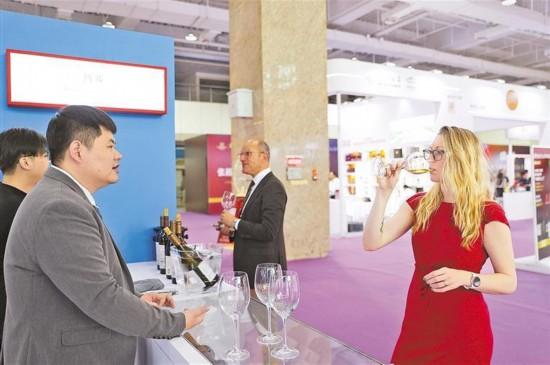 ③ 外國嘉賓在展會現場品鑒葡萄酒。