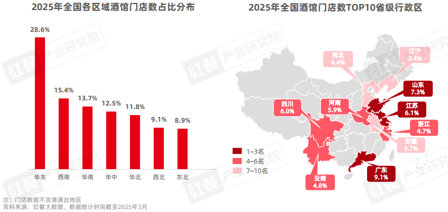 據統計,從區域分布上來看,華東地區的小酒館門店最多,廣東、山東、江蘇等省份酒館文化發展迅速。