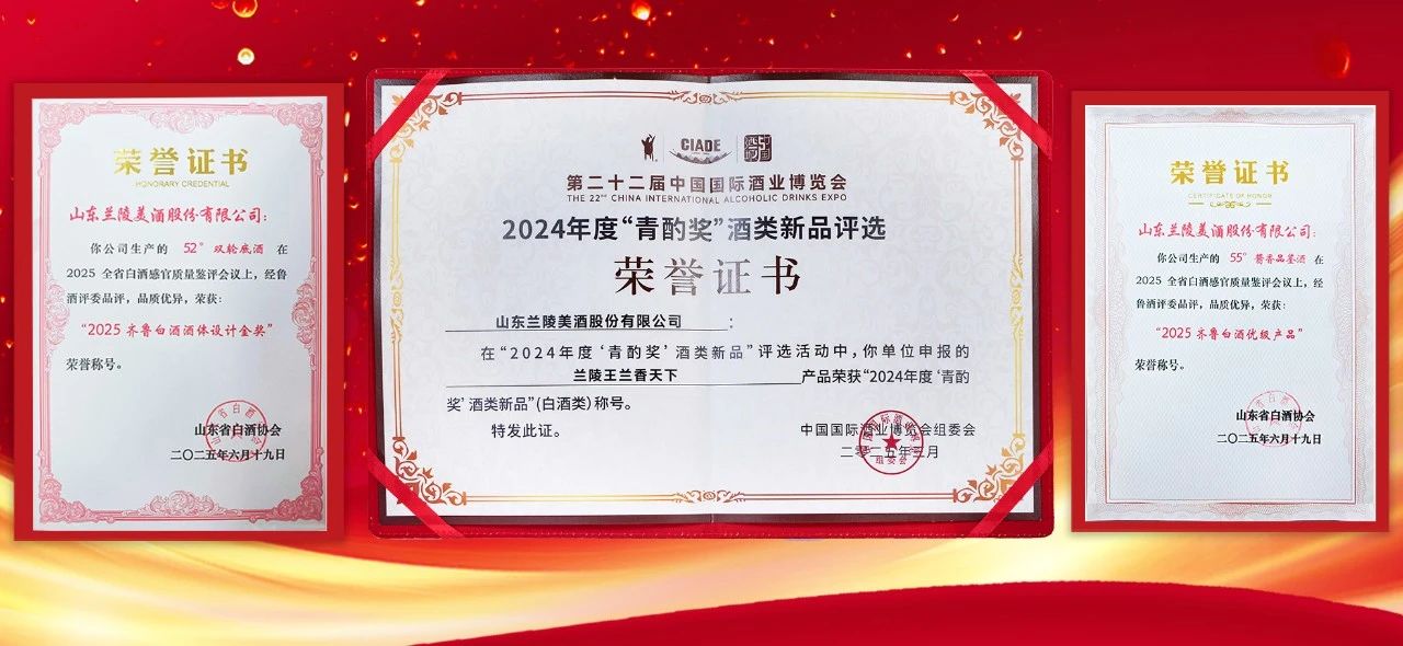 今年來(lái),蘭陵美酒作為魯酒領(lǐng)軍企業(yè),在打造優(yōu)質(zhì)產(chǎn)品的同時(shí),獲得多項(xiàng)重磅獎(jiǎng)項(xiàng),公司“蘭陵52°雙輪底酒”和“蘭陵55°醬香品鑒酒”分別榮獲“2025齊魯白酒酒體設(shè)計(jì)金獎(jiǎng)”和“2025 齊魯白酒優(yōu)級(jí)產(chǎn)品”榮譽(yù)稱(chēng)號(hào),“蘭陵王·蘭香天下”榮膺“2024年度‘青酌獎(jiǎng)’酒類(lèi)新品”稱(chēng)號(hào)……贏得行業(yè)專(zhuān)家和消費(fèi)者的一致贊譽(yù)。