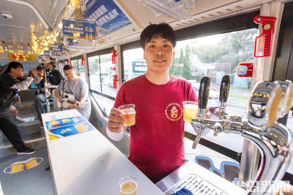 步入車廂,一場沉浸式的啤酒文化之旅即刻開啟。青西金啤等品牌的隨車專業人員會為乘客推薦不同口味的精釀啤酒,車內還配有專業設備確保啤酒口感。“公交+啤酒”的融合讓公交突破了傳統運輸功能,變身為“會跑的啤酒節分會場”。