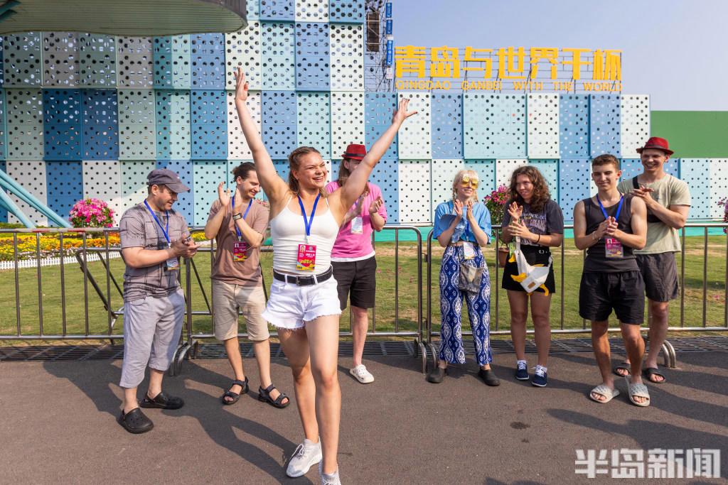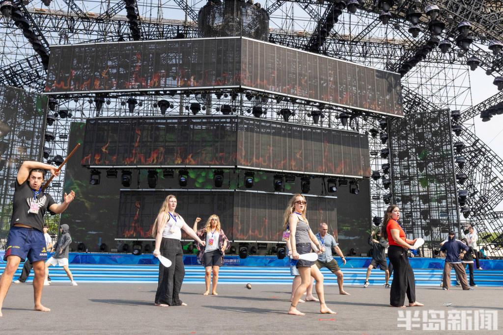 下午3點,演員們正在啤酒城中心舞臺進行開幕式彩排。旋律悠揚的音樂,伴隨著演員們動人的舞蹈。雖然太陽炙烤,他們的舞蹈動作卻沒有絲毫懈怠。