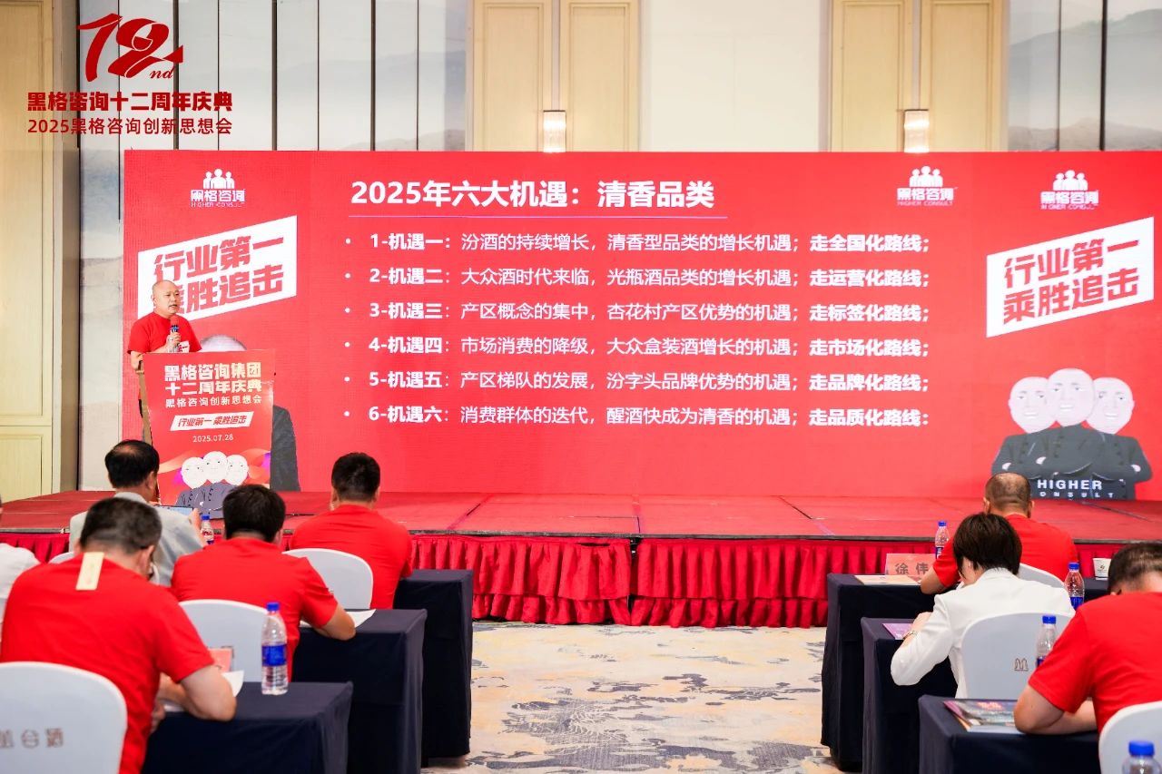 在此背景下,7月28日,黑格咨詢集團在石家莊舉辦十二周年慶典暨創新思想會,以“行業第一,乘勝追擊”為主題,匯聚行業協會領導、酒企代表、營銷專家及媒體人士,共同探討酒業深度調整期的挑戰與機遇。會上,黑格咨詢集團董事長徐偉發布《新環境強競爭下酒類行業趨勢大變局》報告,提出九大趨勢洞察,并聯合多位專家剖析六大核心機遇,為行業逆勢增長提供戰略指引。