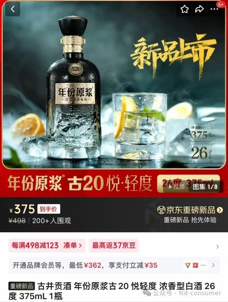 8 月 18 日,古井貢酒(000596.SZ)推出新品 " 古井貢酒 · 年份原漿輕度古 20",酒精度 26 度,容量分別為 375ml 和 100ml,這是古井貢酒近年推出的首款低度白酒新品。