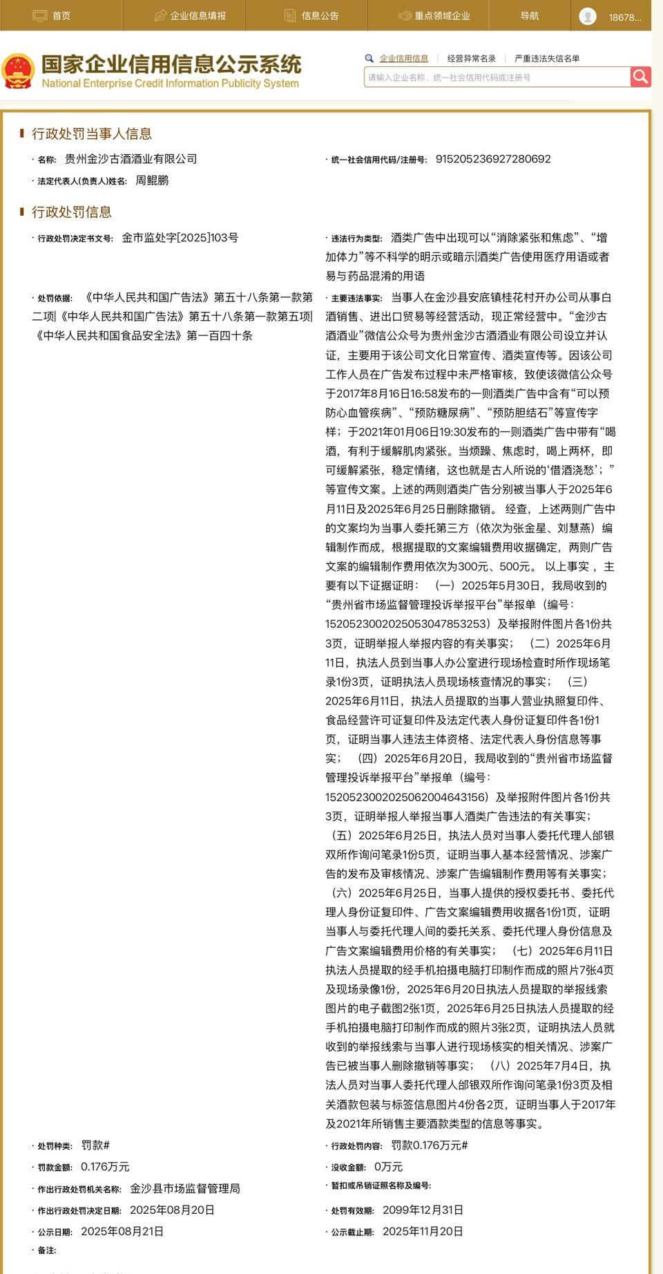 近日,金沙縣市場監督管理局對貴州金沙古酒酒業有限公司發布行政處罰決定書(金市監處字[2025]103號)。該公司因在其認證的微信公眾號上發布違法酒類廣告,被處以罰款1760元。 經查,該公