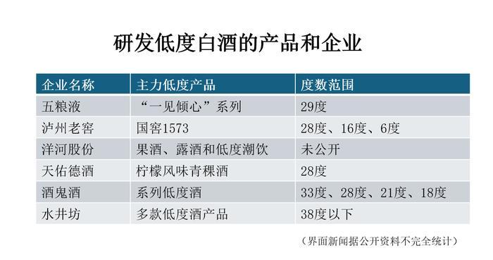 現階段,頭部酒企加速推進低度化,五糧液計劃推出29度“一見傾心”(曾于1990年代初推出同度數產品后停產),瀘州老窖28度國窖1573已研發成功并擬開發16度、6度產品,洋河股份、水井坊、酒鬼酒、天佑德酒等也已研發或推出低度酒,市場上甚至出現檸檬口味白酒。