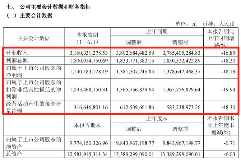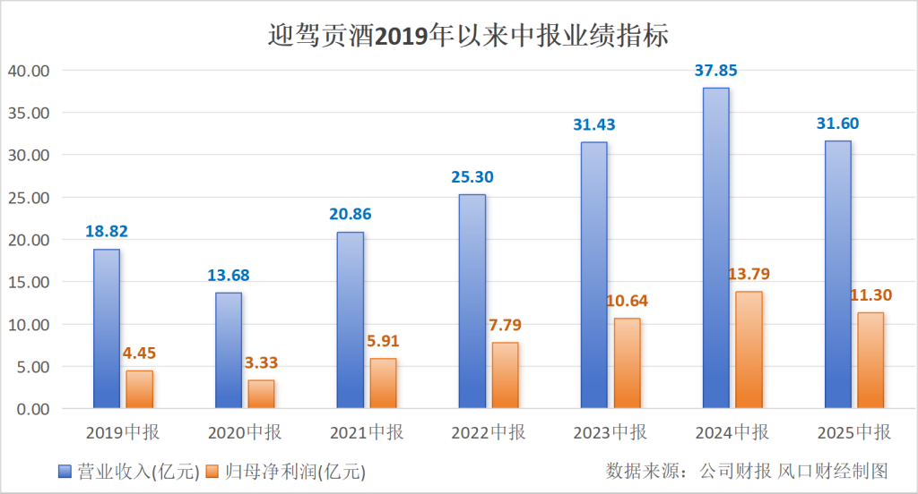 8月25日晚間,作為“四大徽酒”之一的迎駕貢酒披露2025年半年度報告。報告期內,公司實現營業收入31.6億元,同比下降16.89%;歸屬于上市公司股東的凈利潤為11.3億元,同比下降18.19%。這是其自2020年以來首次半年度業績雙降。