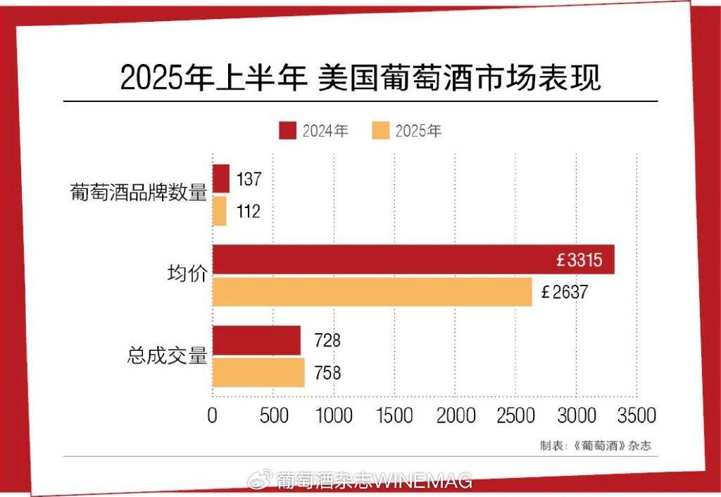 2025 年上半年,美國葡萄酒市場面臨明顯挑戰。從價格表現看,在兩年內均有交易的78種葡萄酒中,僅18%在2025年的平均售價高于2024年,這意味著超80%的酒款價格有所下降,這也使美國在平均價格跌幅指標上,成為繼波爾多后,本報告所有地區中跌幅第二大的地區。不過,美國葡萄酒市場的交易量保持相對穩定,2025年交易總額甚至有望小幅超過2024年。