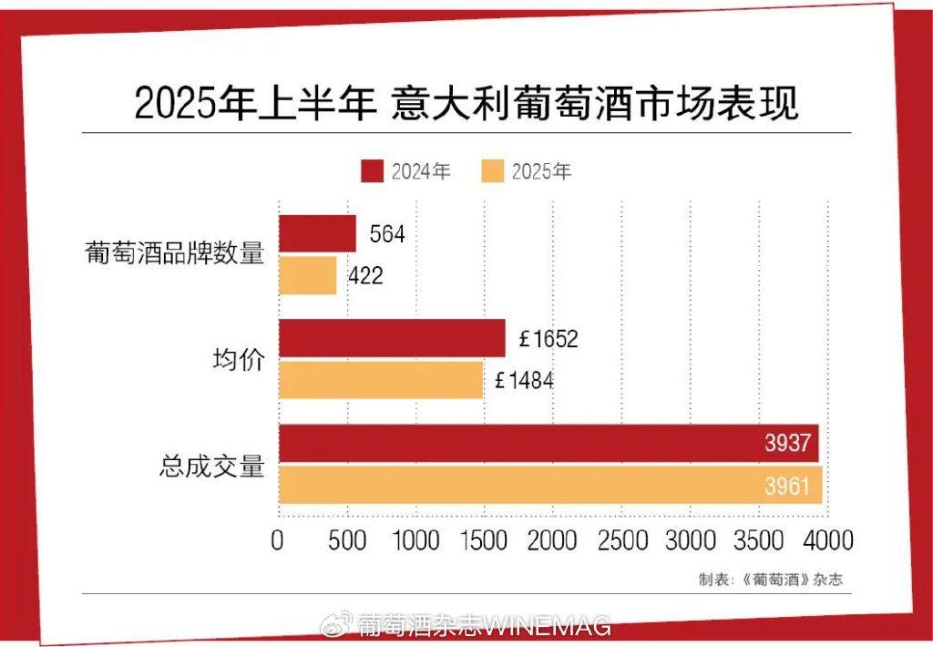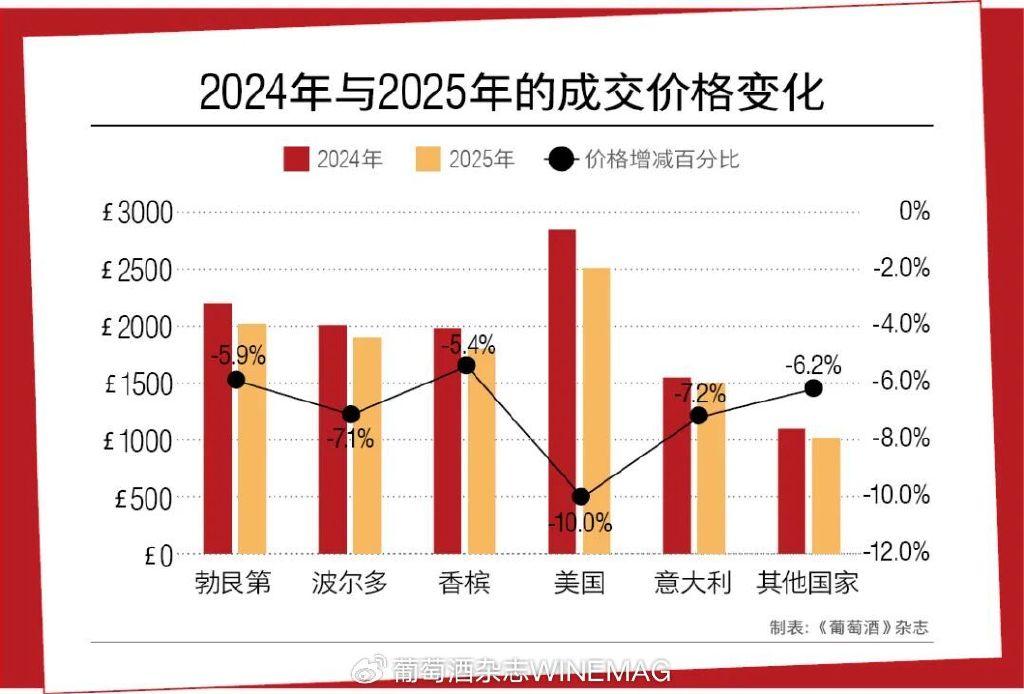 在2024年和2025年交易的338種意大利葡萄酒中,平均價格下跌了7.2%。盡管跌幅較大,但仍有30%的意大利葡萄酒成交價格高于去年。