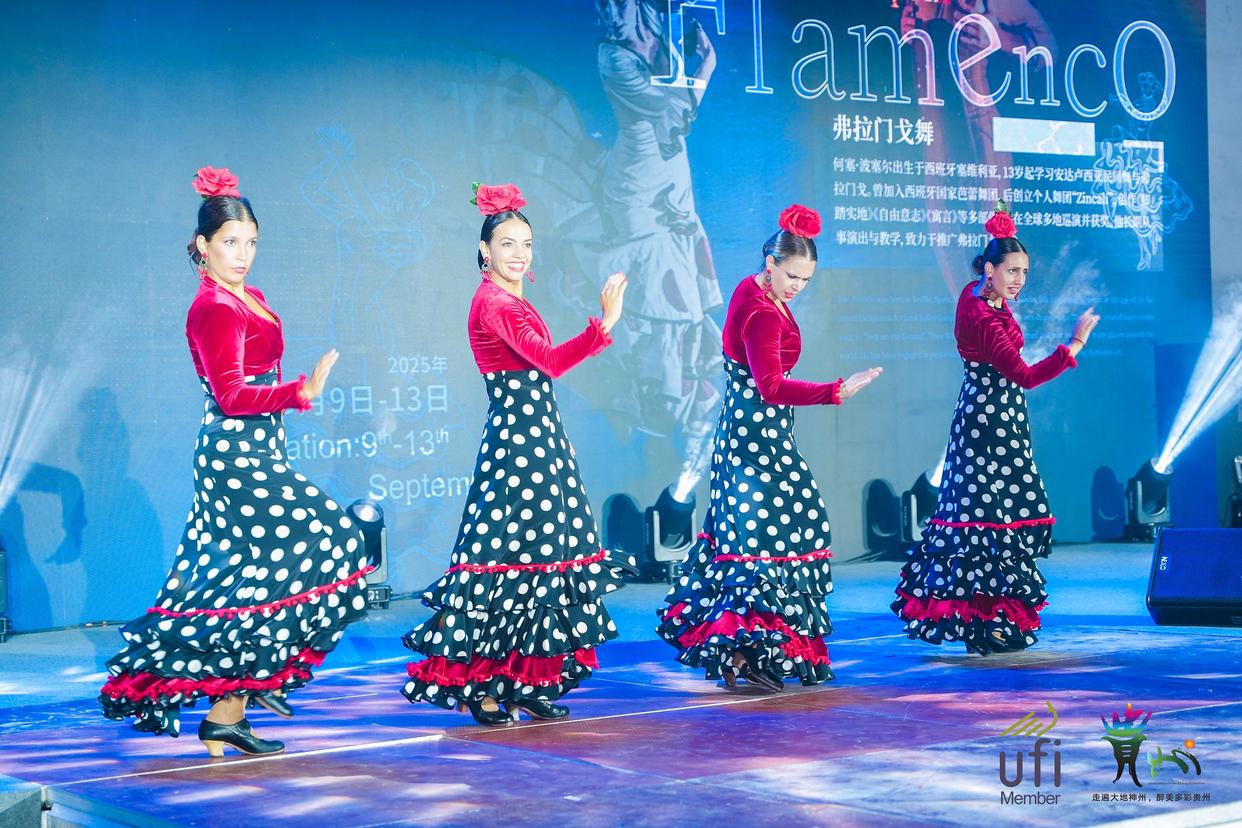 第十四屆中國(貴州)國際酒類博覽會舉辦期間,一場跨越山海的文化對話在貴陽上演。西班牙何塞波塞爾弗拉門戈舞團(Ballet Flamenco Jos Porcel)與貴州村T表演團隊于9月10日聯(lián)袂呈現(xiàn)融合舞蹈