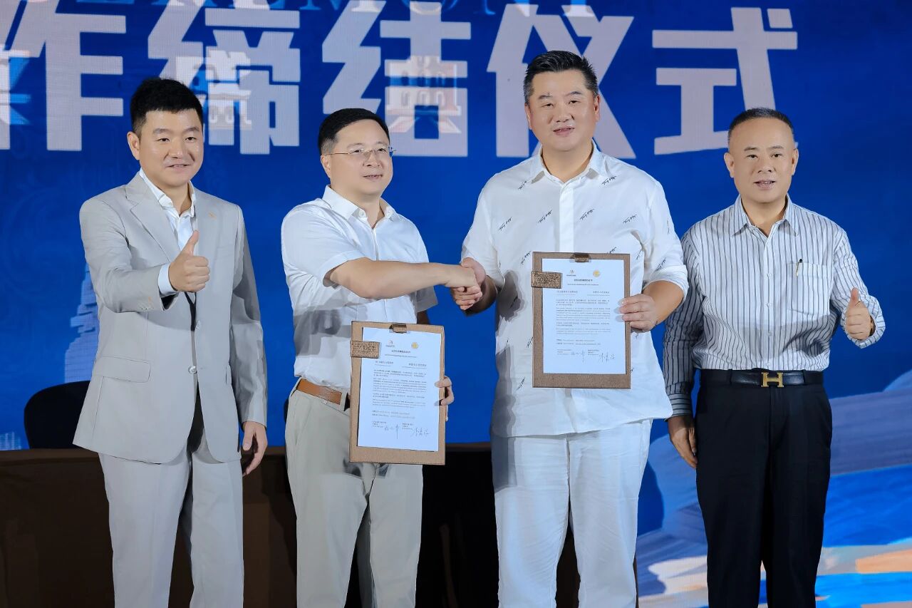 泰國中華總商會副主席李桂雄(右一)與瀘州老窖銷售有限公司黨委書記、總經(jīng)理張彪(左一)一同見證友好締結(jié)時刻