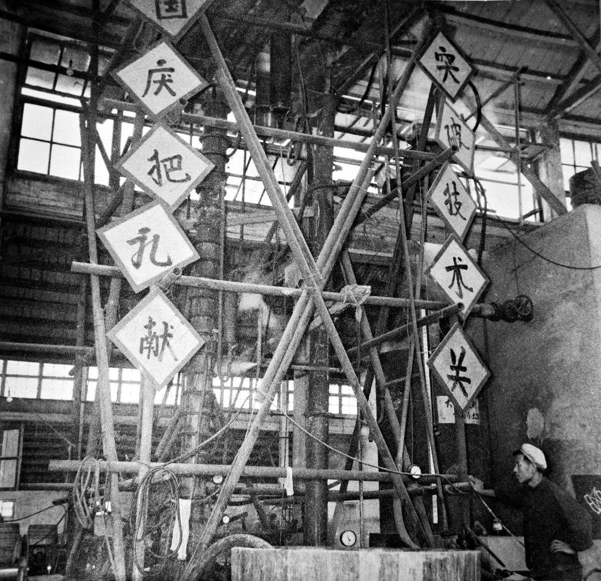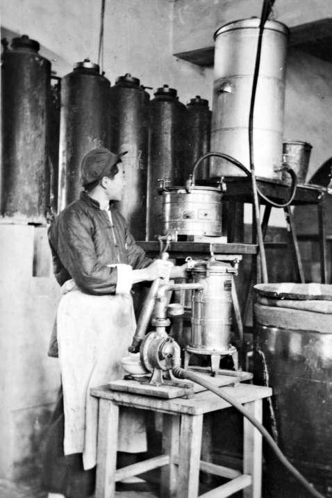 建設(shè)中的實驗廠接到了一項任務(wù)——為迎接新中國的誕生生產(chǎn)一批獻禮酒,這就是“紅星二鍋頭”。圖為1950年代的白酒釀造車間。