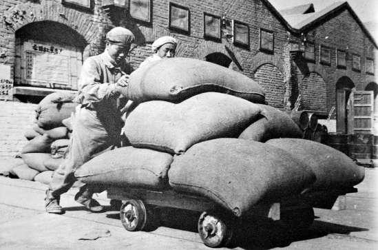 建廠初期工人勞作的場景。當時的生產(chǎn)工具十分簡陋,只有木锨、簸籮、簸箕和掃帚。