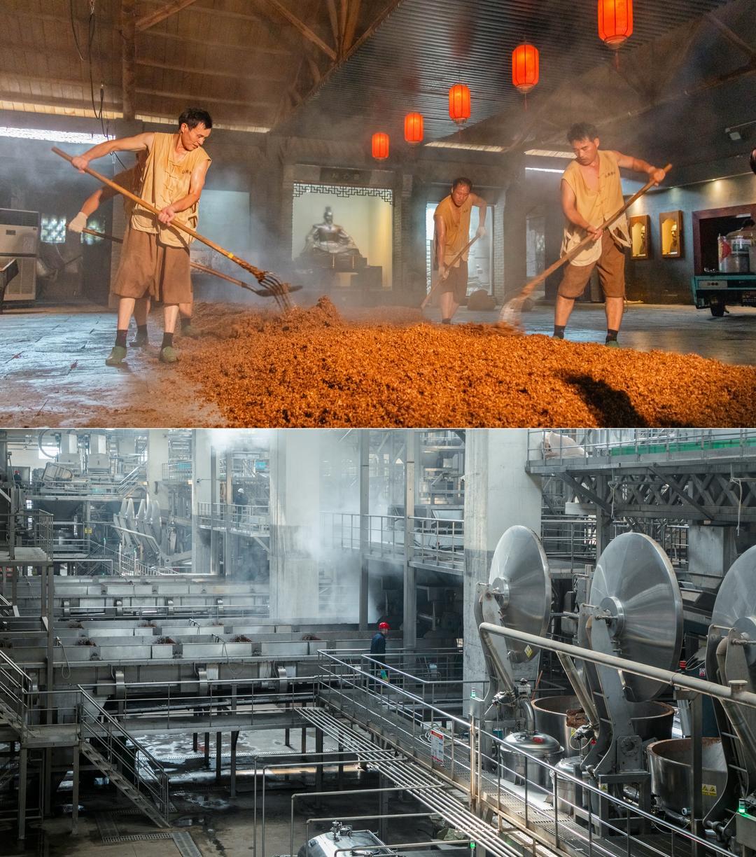 古井貢酒·年份原漿傳統釀造區(上)與古井智能園釀酒車間(下)