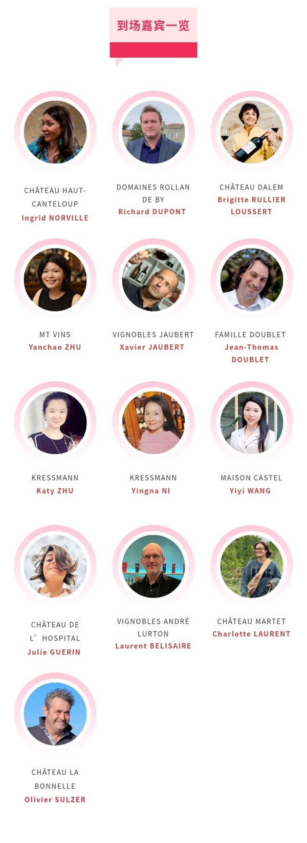 來自波爾多的12位產(chǎn)區(qū)代表將為您呈現(xiàn)六大核心產(chǎn)區(qū)的風(fēng)土奧秘。他們將分享產(chǎn)區(qū)故事、釀酒智慧與前沿趨勢。