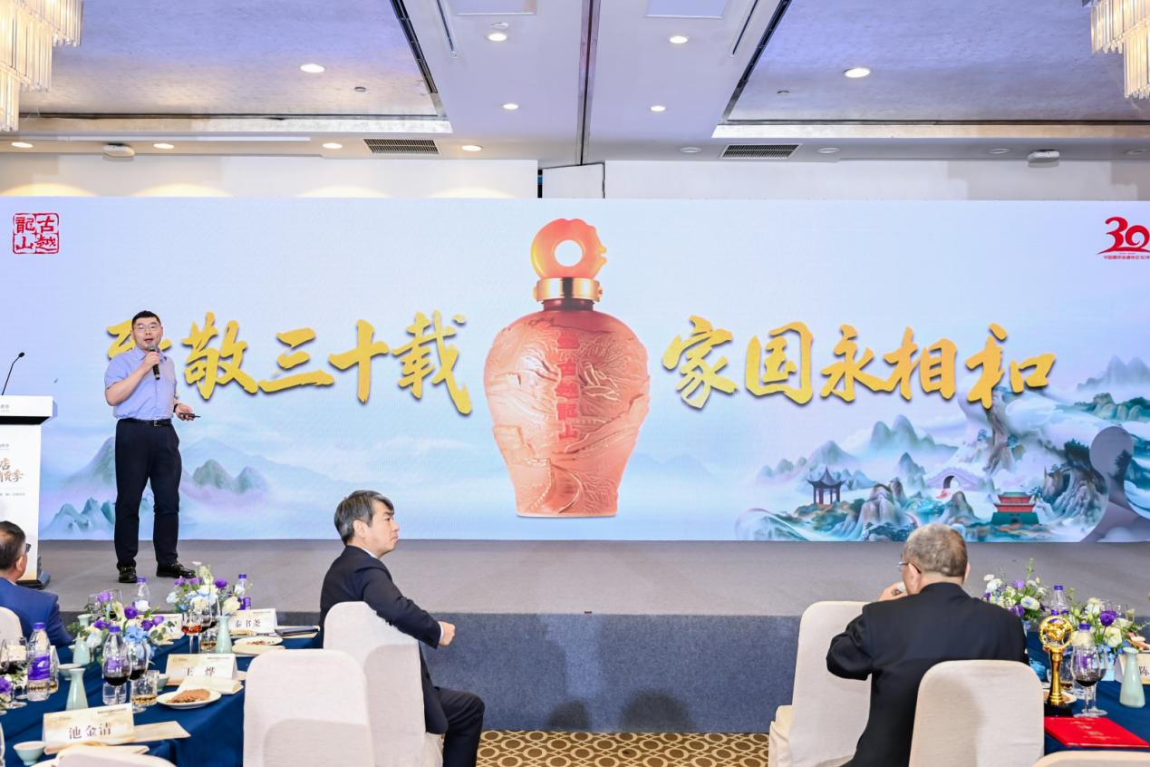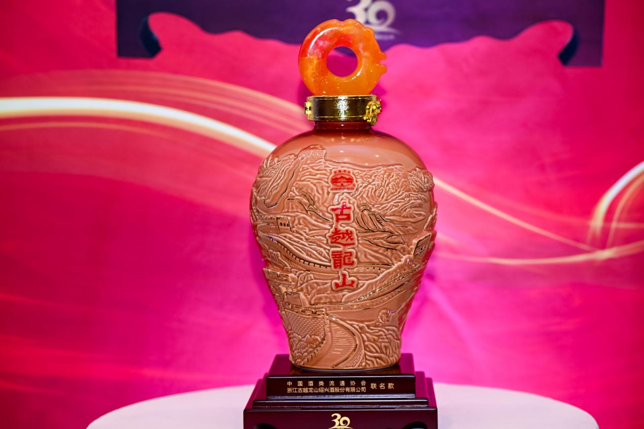 柏宏介紹,“古越龍山·家國永和30年陳紹興酒”以恰逢其時的30年陳釀年份,成為中國酒類流通協會成立三十周年發展歷程的實體見證。這款酒容量達4.75升,在包裝設計上融合了良渚玉龍圖騰、長城意象等經典文化元素,瓶體造型莊重典雅,兼具藝術欣賞與收藏傳承價值。