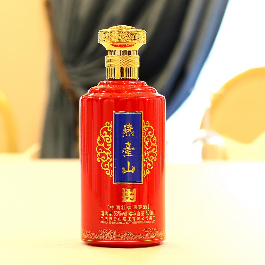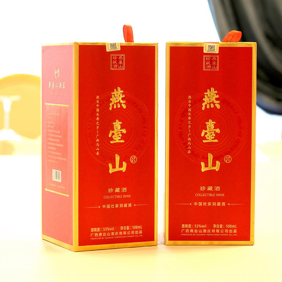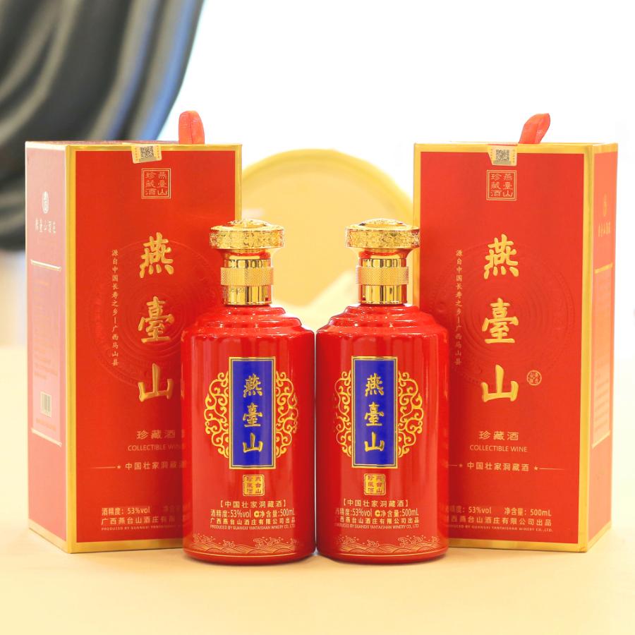 包裝禮盒設計以中國紅為主色調,搭配金色邊框與精致紋樣,盒身正面“燕臺山”金色大字醒目大氣,下方標注 “珍藏酒”“中國壯家洞藏酒”,側面印有“源自中國長壽之鄉——廣西馬山縣”標識,將傳統美學與文化底蘊完美融合。酒瓶是紅色陶瓷瓶身搭配藍底金紋“燕臺山”品牌標識,金色瓶蓋與纏枝紋盡顯雅致;瓶身標注“酒精度53% vol凈含量500mL” 等信息,細節之處彰顯專業品質,讓消費者在428元價位即可擁有兼具格調與品質的飲酒體驗。