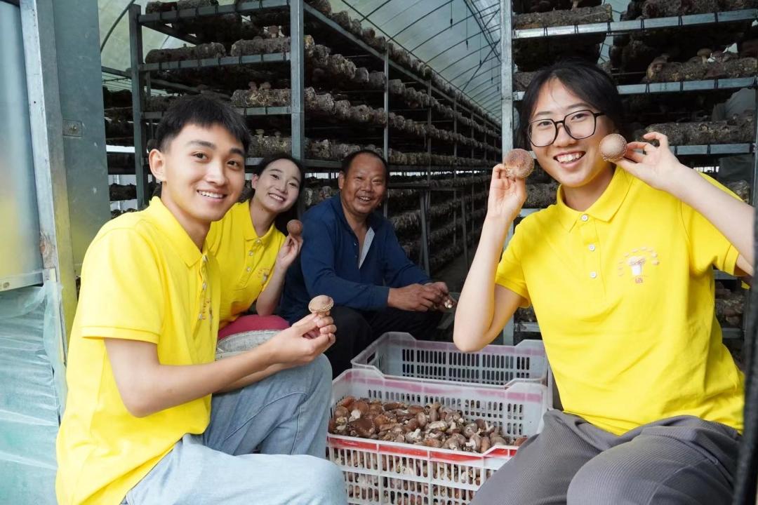 袁尊溢(左二)和“‘硒’望無限”團隊成員在道真茅臺幫扶園實地跟蹤酒糟菌棒生長情況(受訪者供圖)