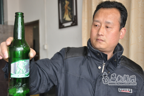 酒店業主譚先生當即撥打了酒瓶上的南昌啤酒服務電話,很快對方派了一位龔姓男子來到現場。經過仔細查看,廠方表示瓶酒里面是一團香煙盒外包裝透明塑料紙。譚先生說:“啤酒廠家的龔先生來了以后,提出解決的方案是,一賠十,但是我堅決不同意這樣的提法。”