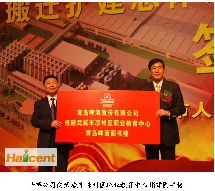青島啤酒公司副總裁黃克興表示,青島啤酒將積極支持武威市委市政府“工業強市”和“生態安全”戰略,作為扎根甘肅、落戶武威的企業公民,青島啤酒始終堅信企業發展是責任付出與信任收獲的互動過程,付出的是責任,收獲的是信任。青島啤酒一直積極履行企業公民責任,全面回報股東資本、社會資本、環境資本和人力資本。簽約儀式上,青島啤酒公司宣布捐建武威市涼州區職業教育中心—青島啤酒圖書樓。