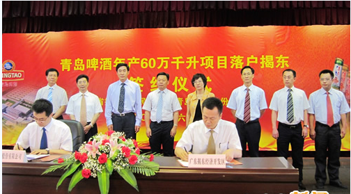 6月24日,2011廣東揭陽市招商引資暨捐贈大會在揭陽市念慈體育館隆重舉行。期間,青島啤酒年產60萬千升生產基地落戶揭陽作為當地重大的招商引資項目舉行了簽約儀式。當日,廣東省、揭陽市及青島啤酒公司等相關領導出席了項目簽約儀式。