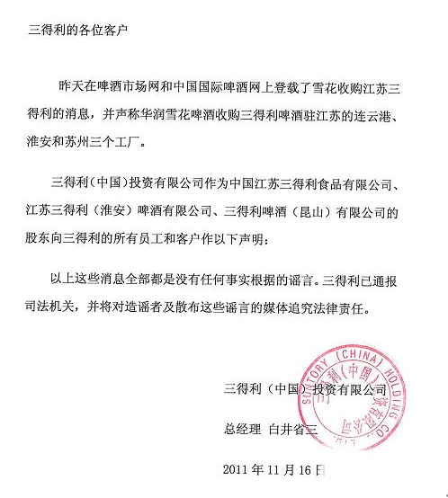 近日,個別網(wǎng)站發(fā)布了雪花收購江蘇三得利的消息,并聲稱華潤雪花啤酒收購三得利啤酒駐江蘇的連云港、淮安