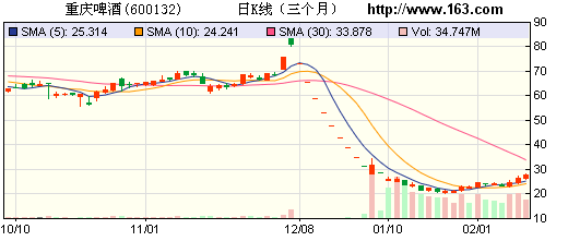 重慶啤酒今日開盤報26.25元,低開1%,盤中大幅拉升,截止時間10:07分,重慶啤酒報27.65元,上漲4.22%,換手近4%,成交金額5.1億元。在股東大會后重慶啤酒3日漲幅超過2成。