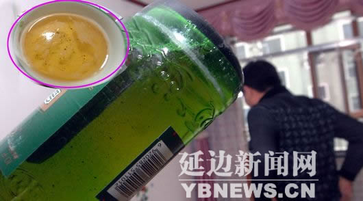 2月22日,延吉市錦繡天景小區的居民馮先生撥打新聞熱線反映,他在樓下超市買了一箱金士百啤酒,回來一喝發現,酒里漂著黑色片狀雜質,看起來十分惡心。