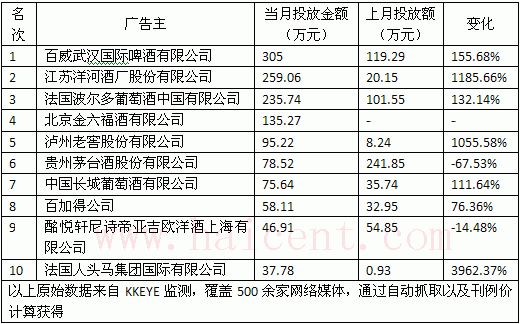 2012年1月酒業品牌網絡廣告投放TOP10廣告主如下表所示,百威啤酒、江蘇洋河、法國波爾多位列三甲。表2012年1月中國酒業品牌網絡廣告投放TOP10廣告主