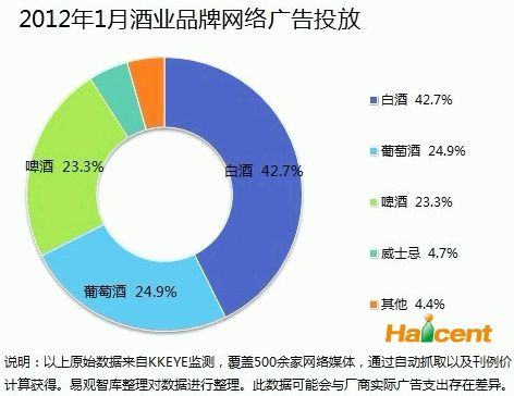根據EnfoDesk易觀智庫研究顯示,2012年1月,酒業品牌網絡廣告投放規模環比大幅上漲39.11%,主要是酒業廠商借節日進行的品牌形象塑造投放拉動。