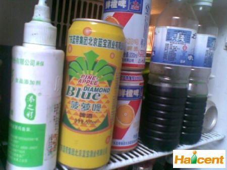 第一層由左至右:依次是綠啤的原料~~~~~添之彩水油兩用色素,廣東生產;菠蘿啤的原料~~~~菠蘿啤,廣東生產的藍帶啤酒;鮮橙啤的原料~~~~~~鮮橙啤,藍帶集團生產;綠啤的原料~~~~~綠藻素,產地不詳;
